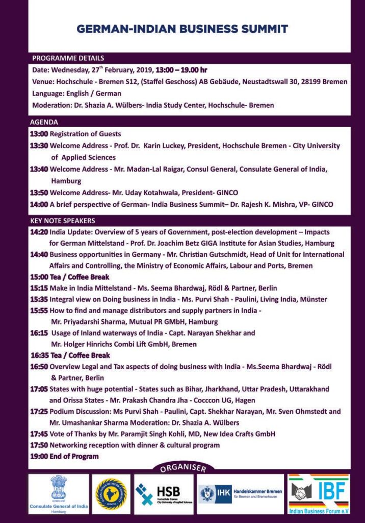 • 13:30 – 14:00: Welcome addresses by Prof. Dr. Karin Luckey (HSB), Mr. Madan-Lal Raigar (Consul General of India, Hamburg), and Mr. Uday Kotahwala (President-GINCO).